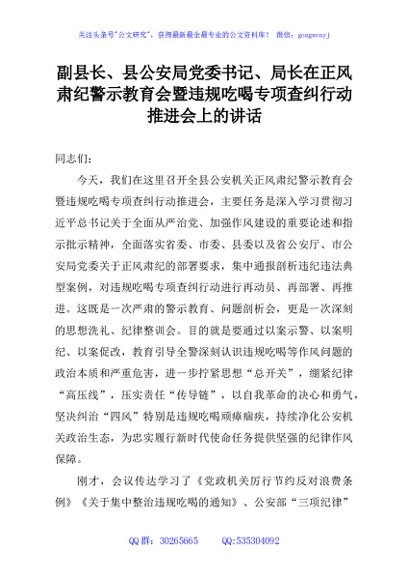 副县长、县公安局党委书记、局长在正风肃纪警示教育会暨违规吃喝专项查纠行动推进会上的讲话 - 公文研究