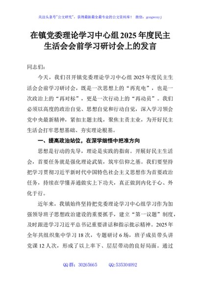 / 在镇党委理论学习中心组2025年度民主生活会会前学习研讨会上的发言
