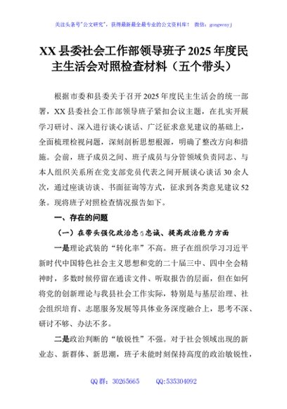 XX县委社会工作部领导班子2025年度民主生活会对照检查材料(五个带头) - 公文研究