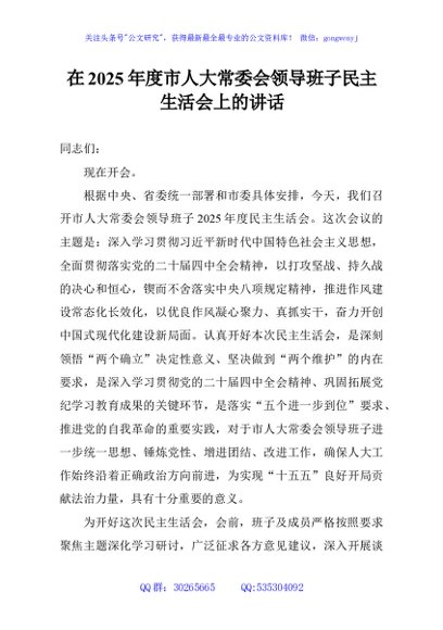 未生成预览图,长按二维码添加 在2025年度市人大常委会领导班子民主生活会上的讲话 - 公文研究