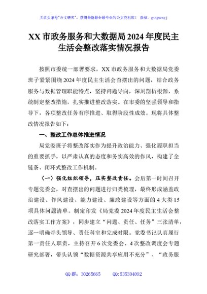 未生成预览图,长按二维码添加 XX市政务服务和大数据局2024年度民主生活会整改落实情况报告 - 公文研究