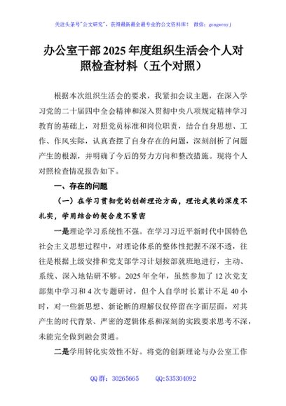 / 办公室干部2025年度组织生活会个人对照检查材料(五个对照)