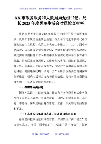 XX市政务服务和大数据局党组书记、局长2025年度民主生活会对照检查材料 - 公文研究