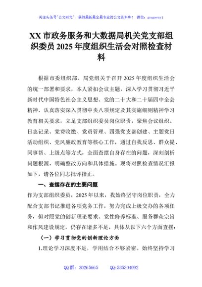 / XX市政务服务和大数据局机关党支部组织委员2025年度组织生活会对照检查材料