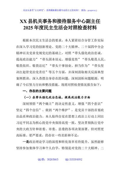 / XX县机关事务和接待服务中心副主任2025年度民主生活会对照检查材料