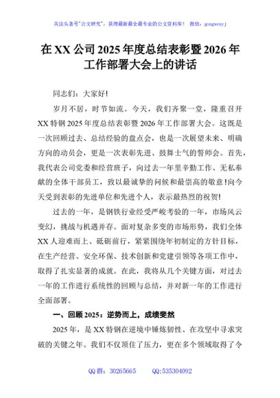 / 在XX公司2025年度总结表彰暨2026年工作部署大会上的讲话