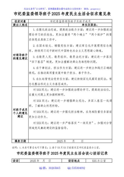 / 市纪委监委领导班子2025年度民主生活会征求意见表