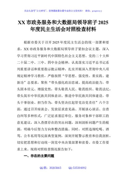 / XX市政务服务和大数据局领导班子2025年度民主生活会对照检查材料