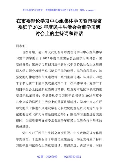/ 在市委理论学习中心组集体学习暨市委常委班子2025年度民主生活会会前学习研讨会上的主持词和讲话