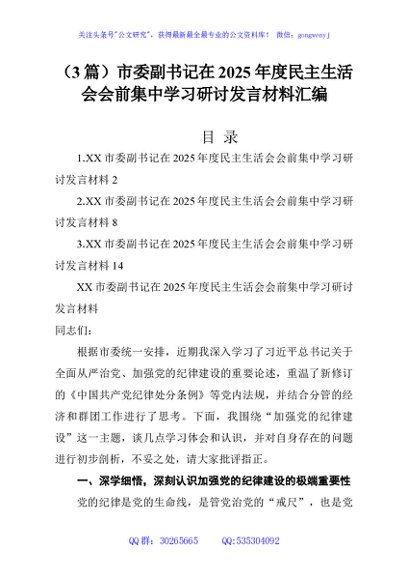 (3篇)市委副书记在2025年度民主生活会会前集中学习研讨发言材料汇编