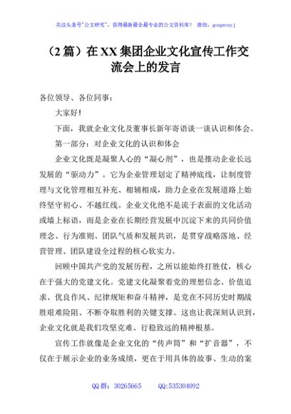 / (2篇)在XX集团企业文化宣传工作交流会上的发言