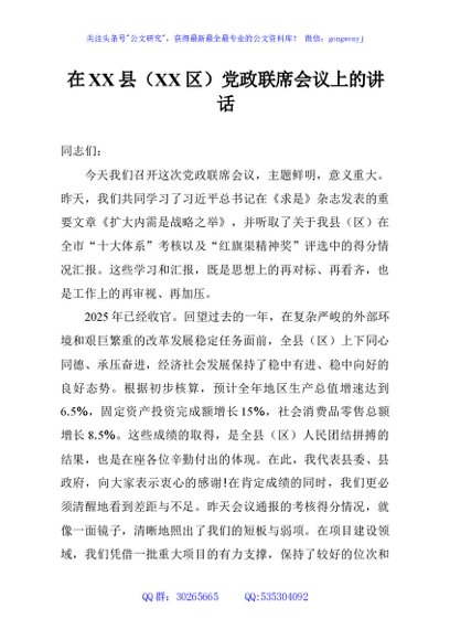 未生成预览图,长按二维码添加 在XX县(XX区)党政联席会议上的讲话 - 公文研究