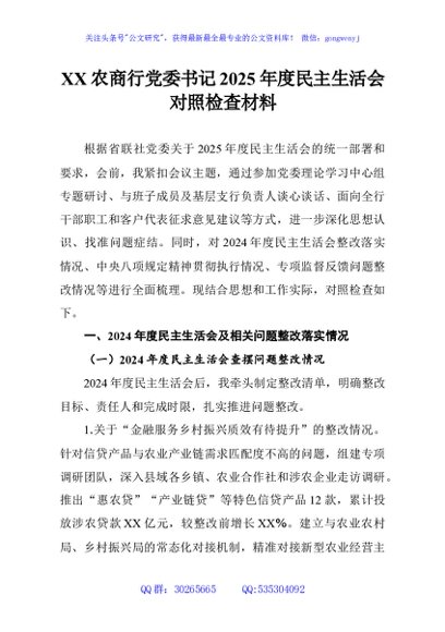 / XX农商行党委书记2025年度民主生活会对照检查材料