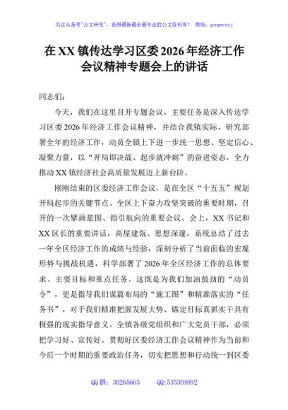 / 在XX镇传达学习区委2026年经济工作会议精神专题会上的讲话