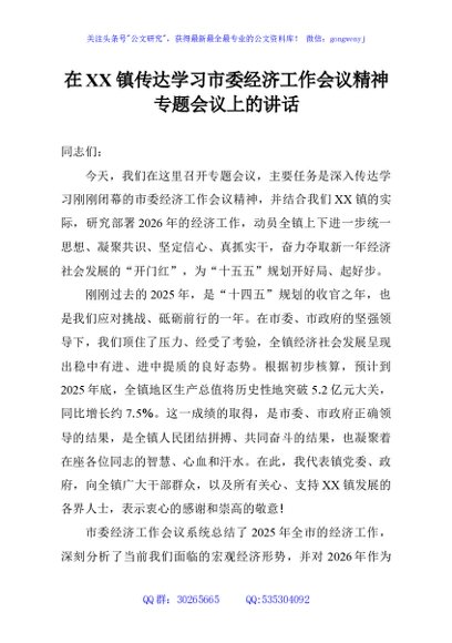 / 在XX镇传达学习市委经济工作会议精神专题会议上的讲话