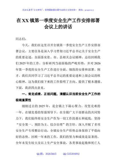 / 在XX镇第一季度安全生产工作安排部署会议上的讲话