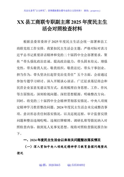 / XX县工商联专职副主席2025年度民主生活会对照检查材料