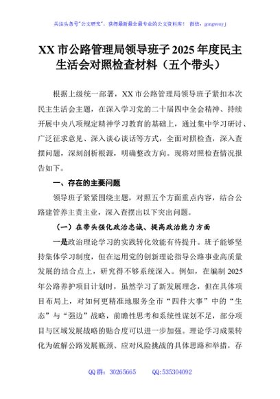 / XX市公路管理局领导班子2025年度民主生活会对照检查材料(五个带头)