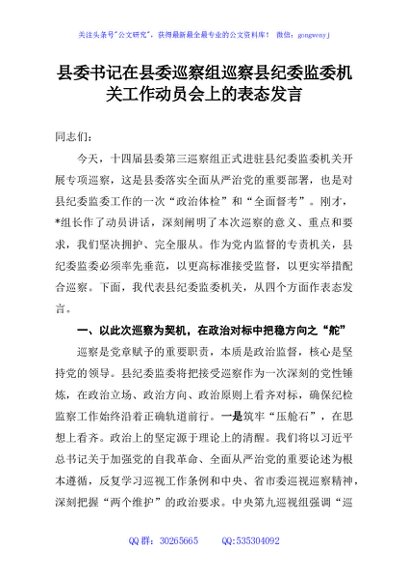 / 县委书记在县委巡察组巡察县纪委监委机关工作动员会上的表态发言