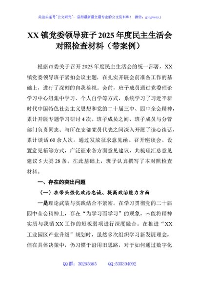 / XX镇党委领导班子2025年度民主生活会对照检查材料(带案例)