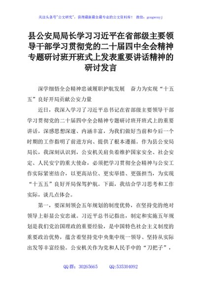 / 县公安局局长学习习近平在省部级主要领导干部学习贯彻党的二十届四中全会精神专题研讨班开班式上发表重要讲话精神的研讨发言