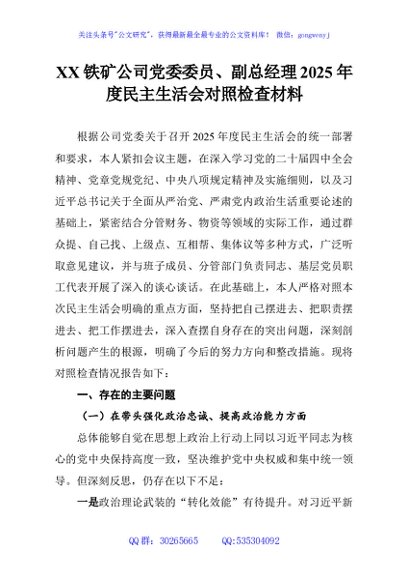 / XX铁矿公司党委委员、副总经理2025年度民主生活会对照检查材料