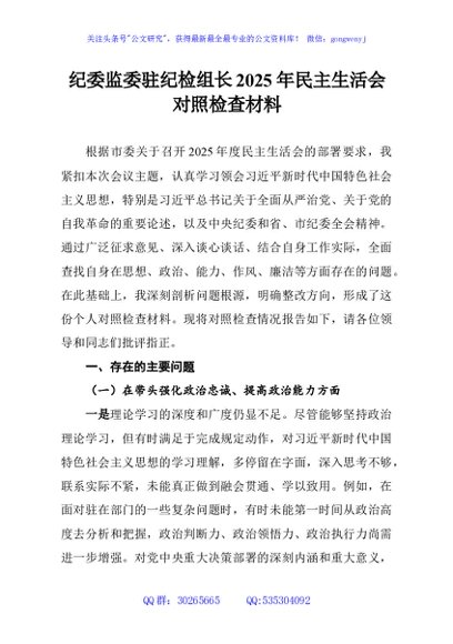 / 纪委监委驻纪检组长2025年民主生活会对照检查材料
