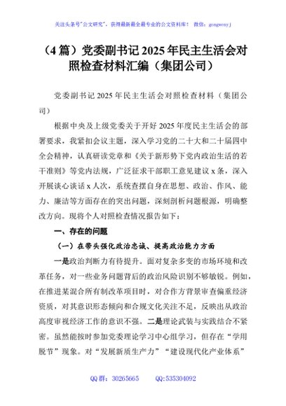 / (4篇)党委副书记2025年民主生活会对照检查材料汇编(集团公司)
