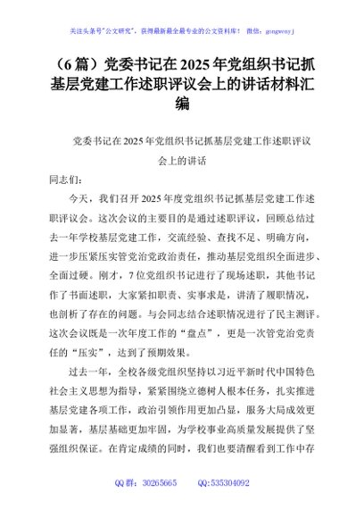 (6篇)党委书记在2025年党组织书记抓基层党建工作述职评议会上的讲话材料汇编