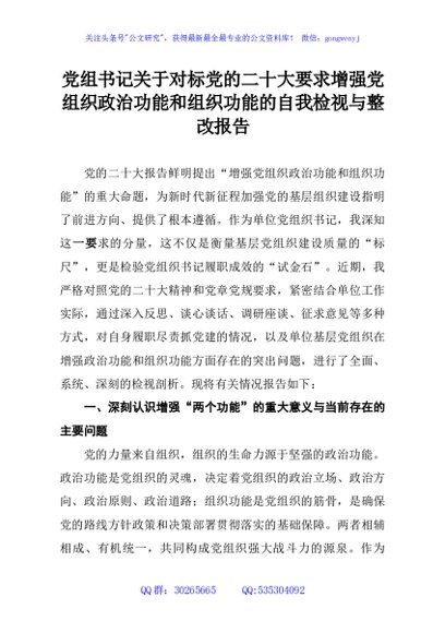 / 党组书记关于对标党的二十大要求增强党组织政治功能和组织功能的自我检视与整改报告