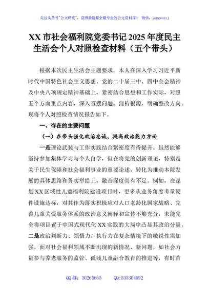 / XX市社会福利院党委书记2025年度民主生活会个人对照检查材料(五个带头)