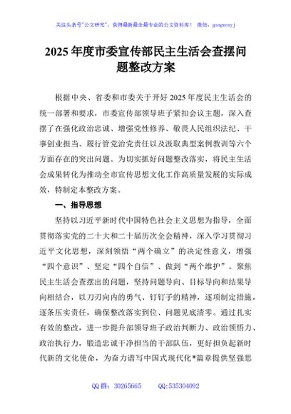 / 2025年度市委宣传部民主生活会查摆问题整改方案