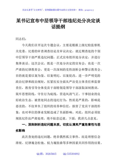 / 某书记宣布中层领导干部违纪处分决定谈话提纲