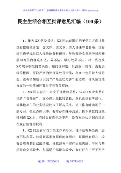 / 民主生活会相互批评意见汇编(100条)