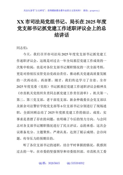 / XX市司法局党组书记、局长在2025年度党支部书记抓党建工作述职评议会上的总结讲话