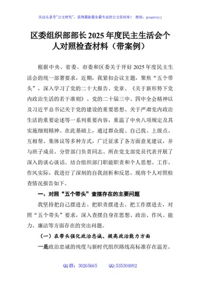 / 区委组织部部长2025年度民主生活会个人对照检查材料(带案例)