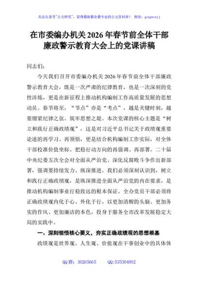 / 在市委编办机关2026年春节前全体干部廉政警示教育大会上的党课讲稿