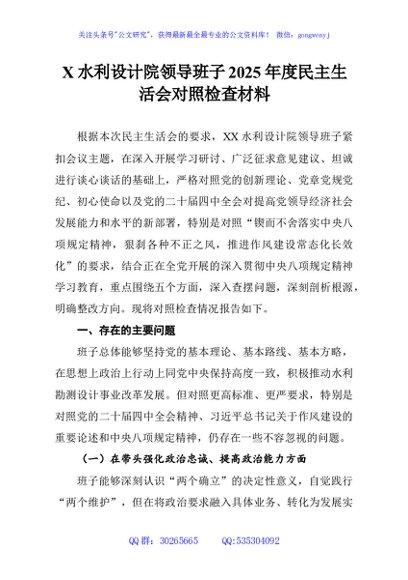 / X水利设计院领导班子2025年度民主生活会对照检查材料