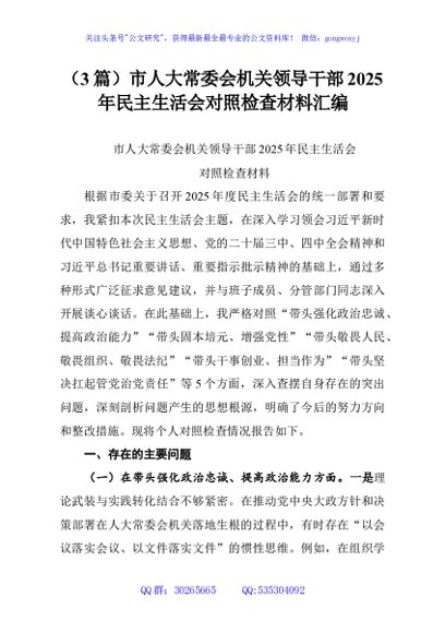 (3篇)市人大常委会机关领导干部2025年民主生活会对照检查材料汇编