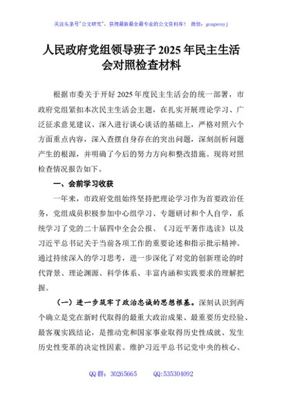 / 人民政府党组领导班子2025年民主生活会对照检查材料