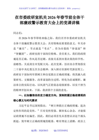 / 在市委政研室机关2026年春节前全体干部廉政警示教育大会上的党课讲稿