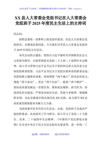 / XX县人大常委会党组书记在人大常委会党组班子2025年度民主生活上的主持词