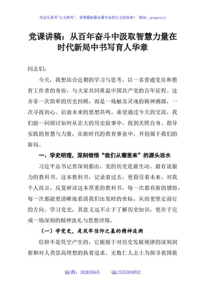 / 党课讲稿:从百年奋斗中汲取智慧力量在时代新局中书写育人华章