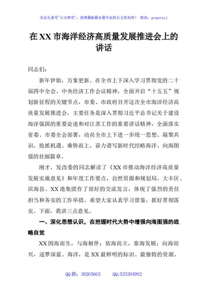 / 在XX市海洋经济高质量发展推进会上的讲话