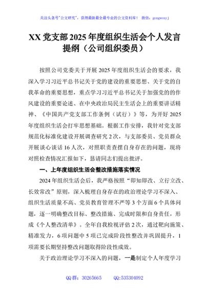 / XX党支部2025年度组织生活会个人发言提纲(公司组织委员)