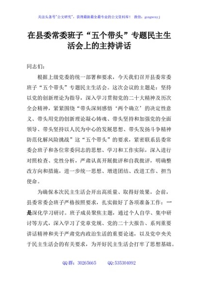 / 在县委常委班子“五个带头”专题民主生活会上的主持讲话