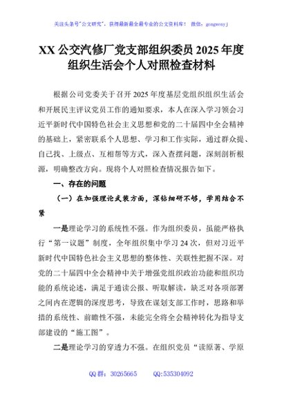/ XX公交汽修厂党支部组织委员2025年度组织生活会个人对照检查材料