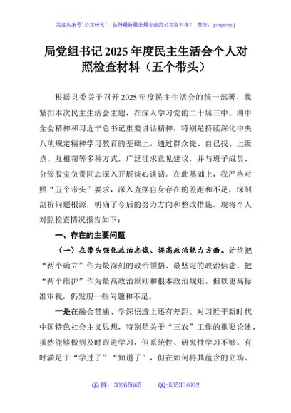 未生成预览图,长按二维码添加 局党组书记2025年度民主生活会个人对照检查材料(五个带头) - 公文研究