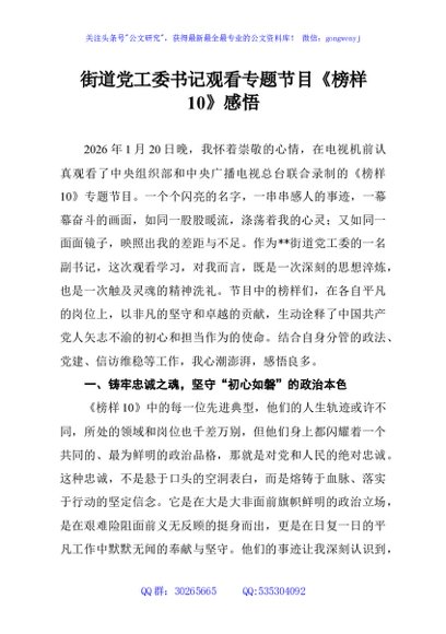 街道党工委书记观看专题节目《榜样10》感悟