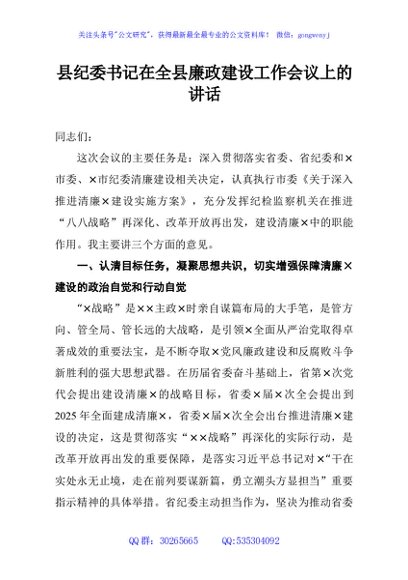 / 县纪委书记在全县廉政建设工作会议上的讲话